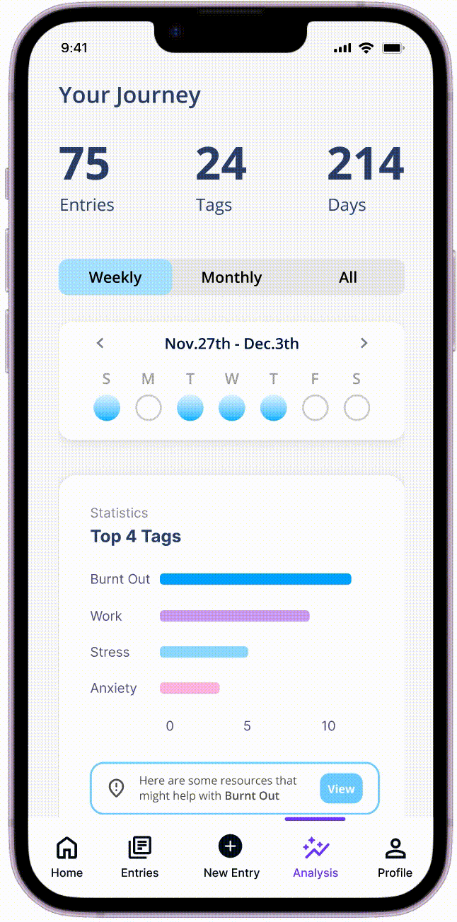 A tagging system allows users to categorize and review journal entries efficiently by themes.